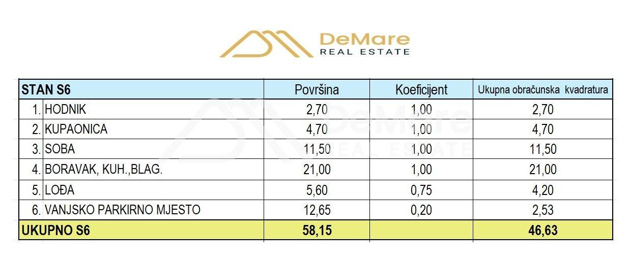 Stanu pripada i jedno parkirno mjesto / 12,65 m2 na okućnici zgrade. Ukupna obračunska vrijednost korisne površine stana iznosi 46,63 m2.
