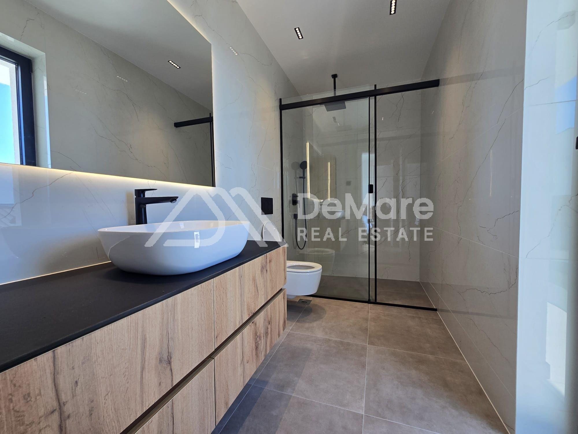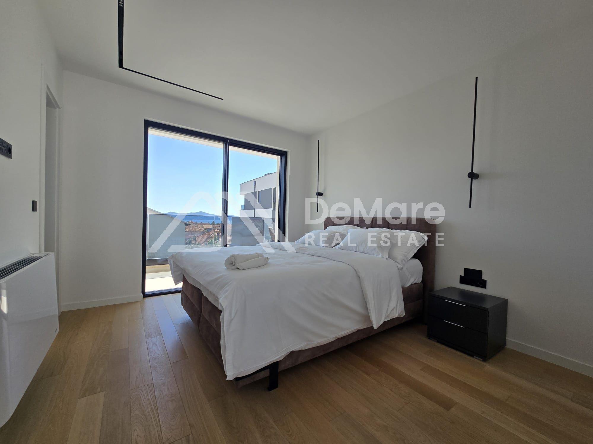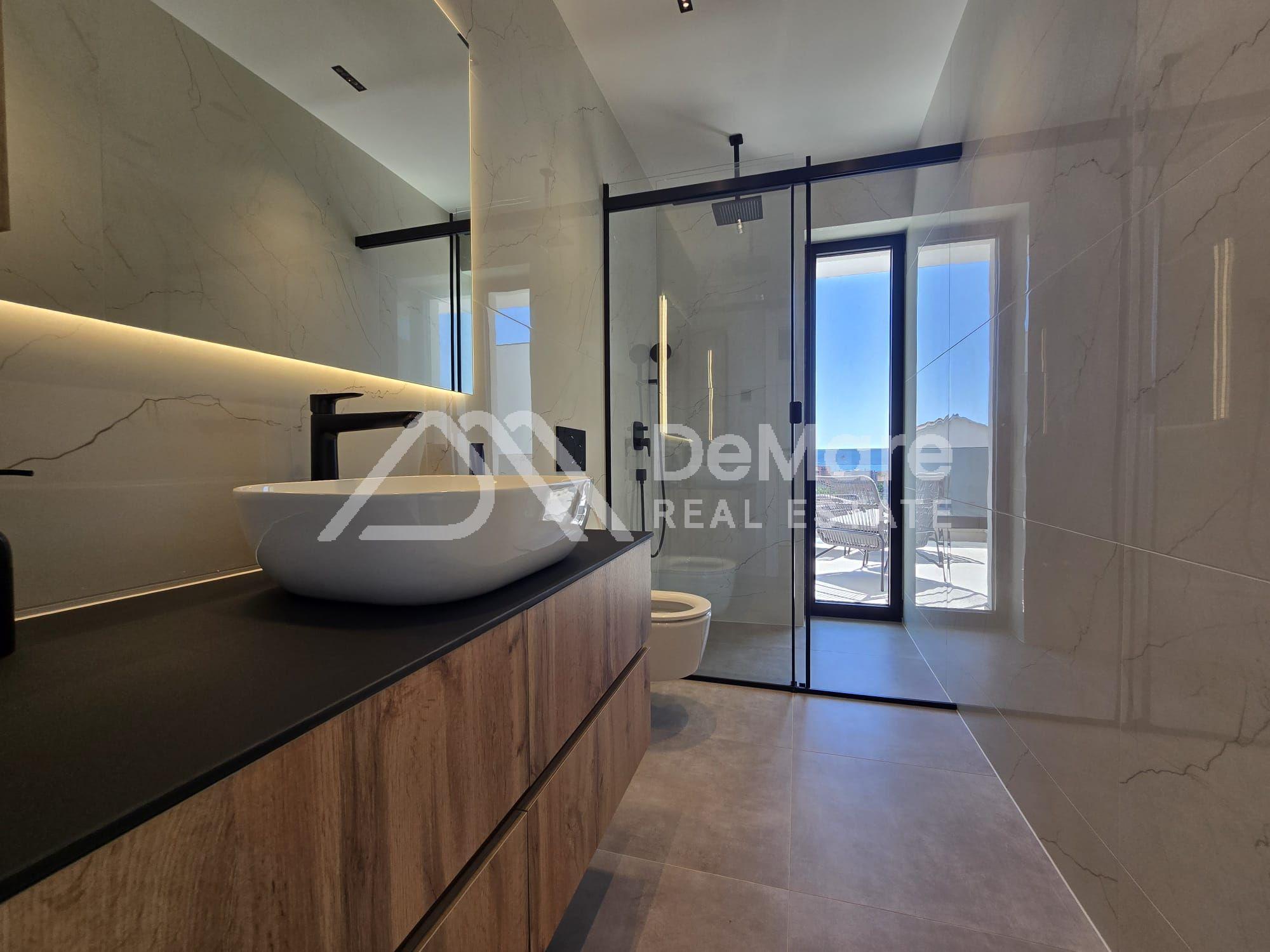 Unutarnje stepenice vode na prvi kat, gdje su smještene tri komforne master spavaće sobe koje imaju vlastite kupaonice i gaderobe, te imaju izlaz na lođu i terasu s koje se pruža pogled na more.
